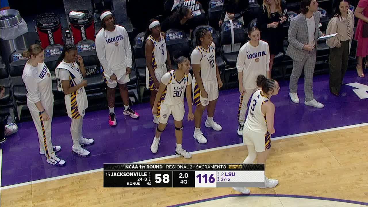 — Flau'jae Johnson scored 20 points, Mikaylah Williams had 18 points and 10 assists, and No. 2 seed LSU easily surpassed it's nation-leading scoring average with a 116-58 victory over 15th seed Jacksonville on Friday night in the first round of